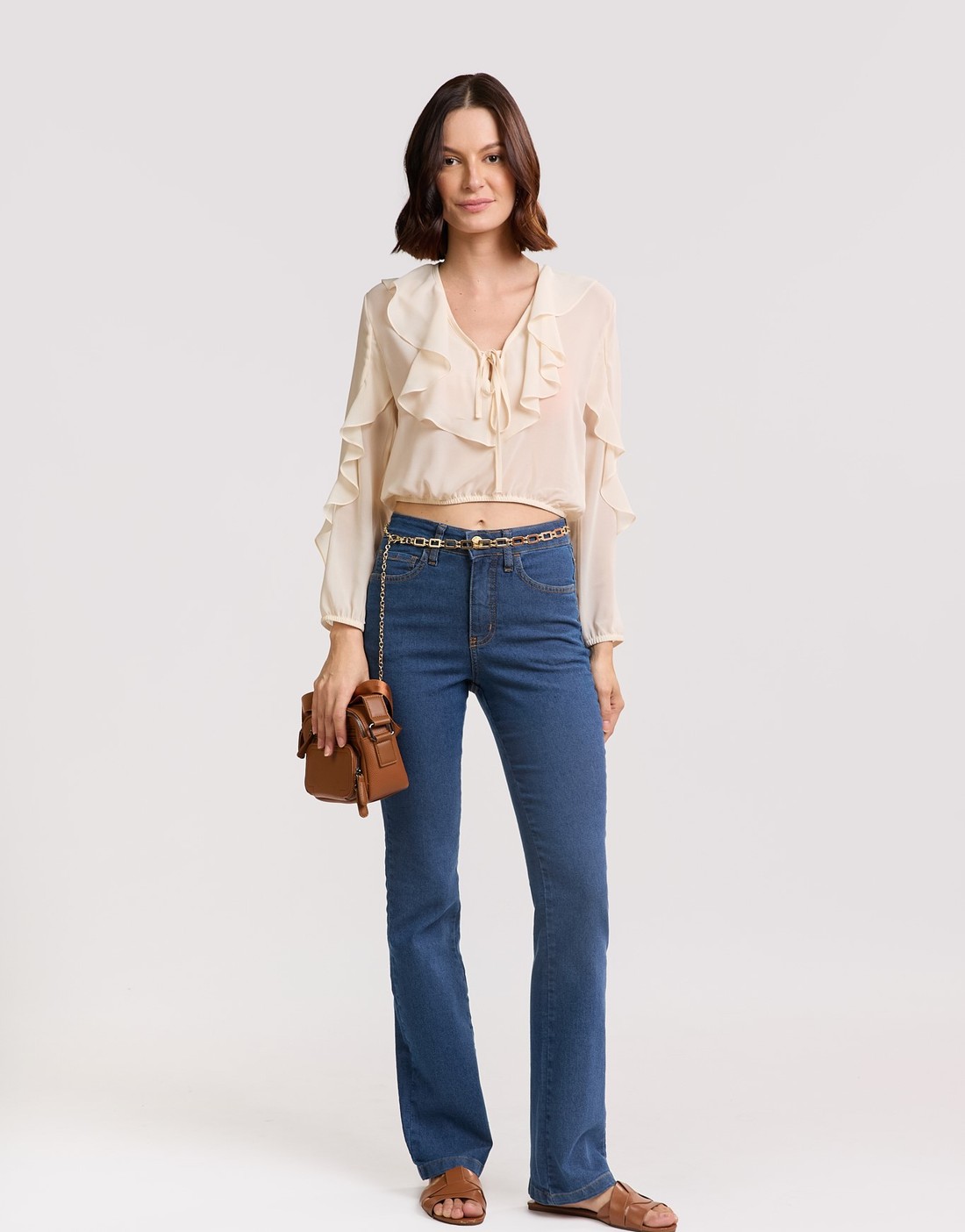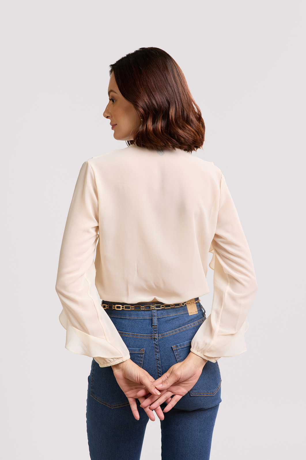 Blusa leve,com modelagem cropped e caimento fluido. O destaque está nos babados frontais e nas mangas compridas,que trazem romantismo e delicadeza ao visual. Possui decote V com ararrçãão e elástico na barra, que garante ajuste confortável e moderno.