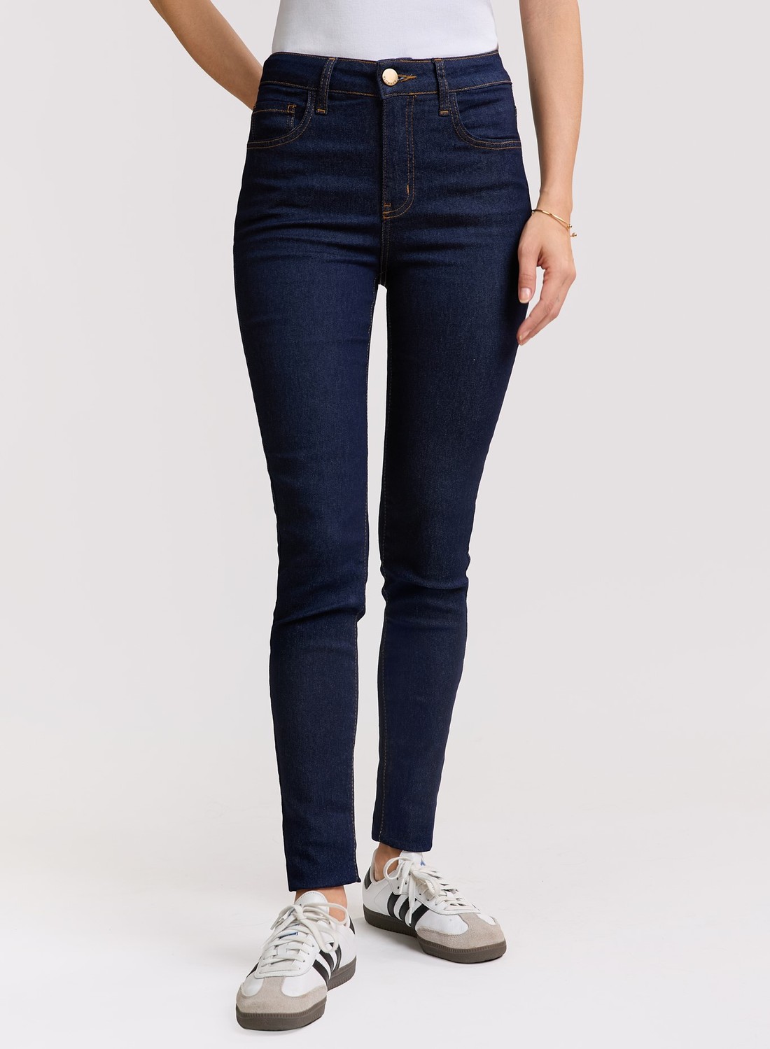 Jeans skinny ajustado ao corpo, com cintura alta e toque flexível para conforto. Clássico e versátil para qualquer ocasião.