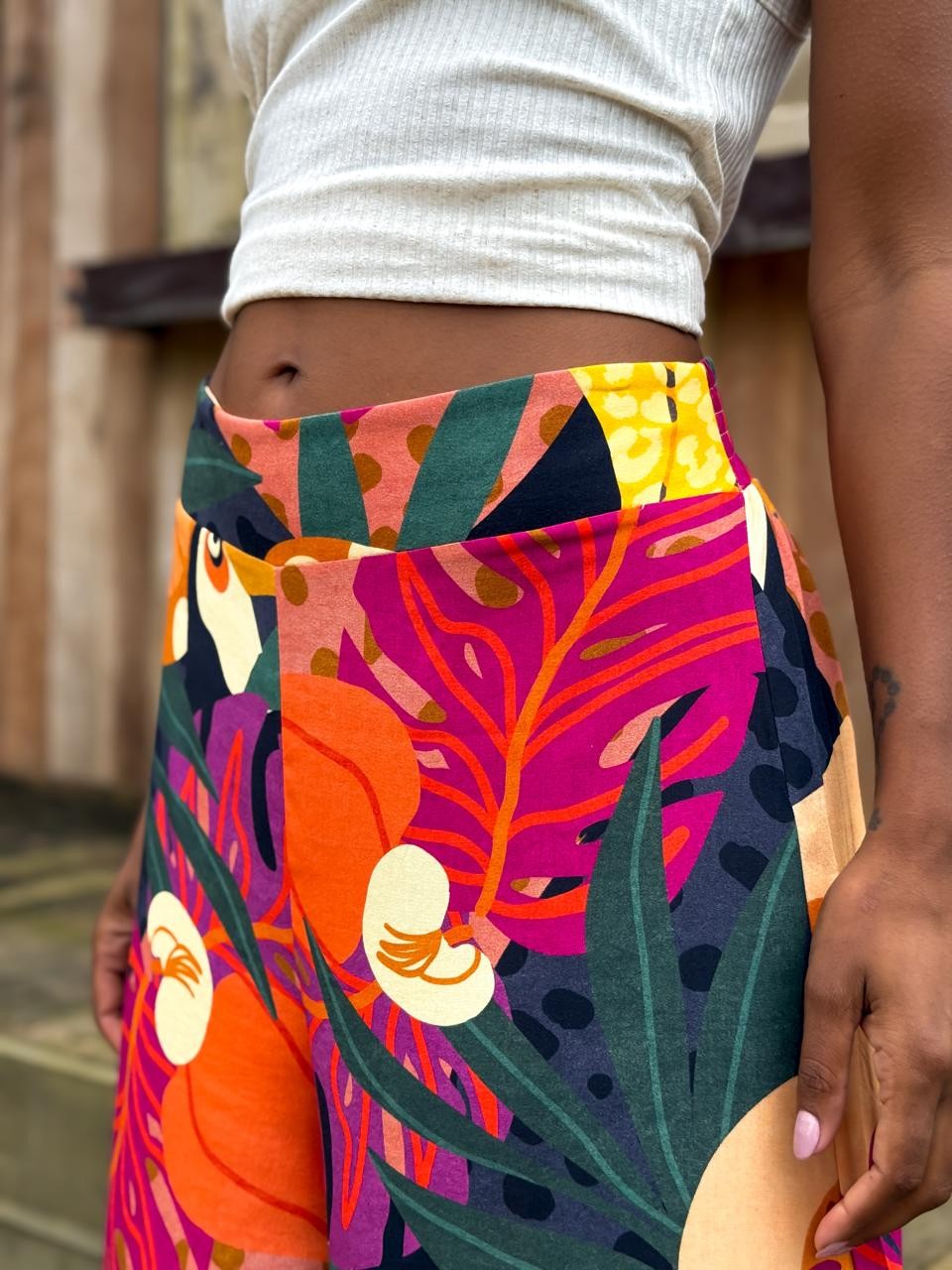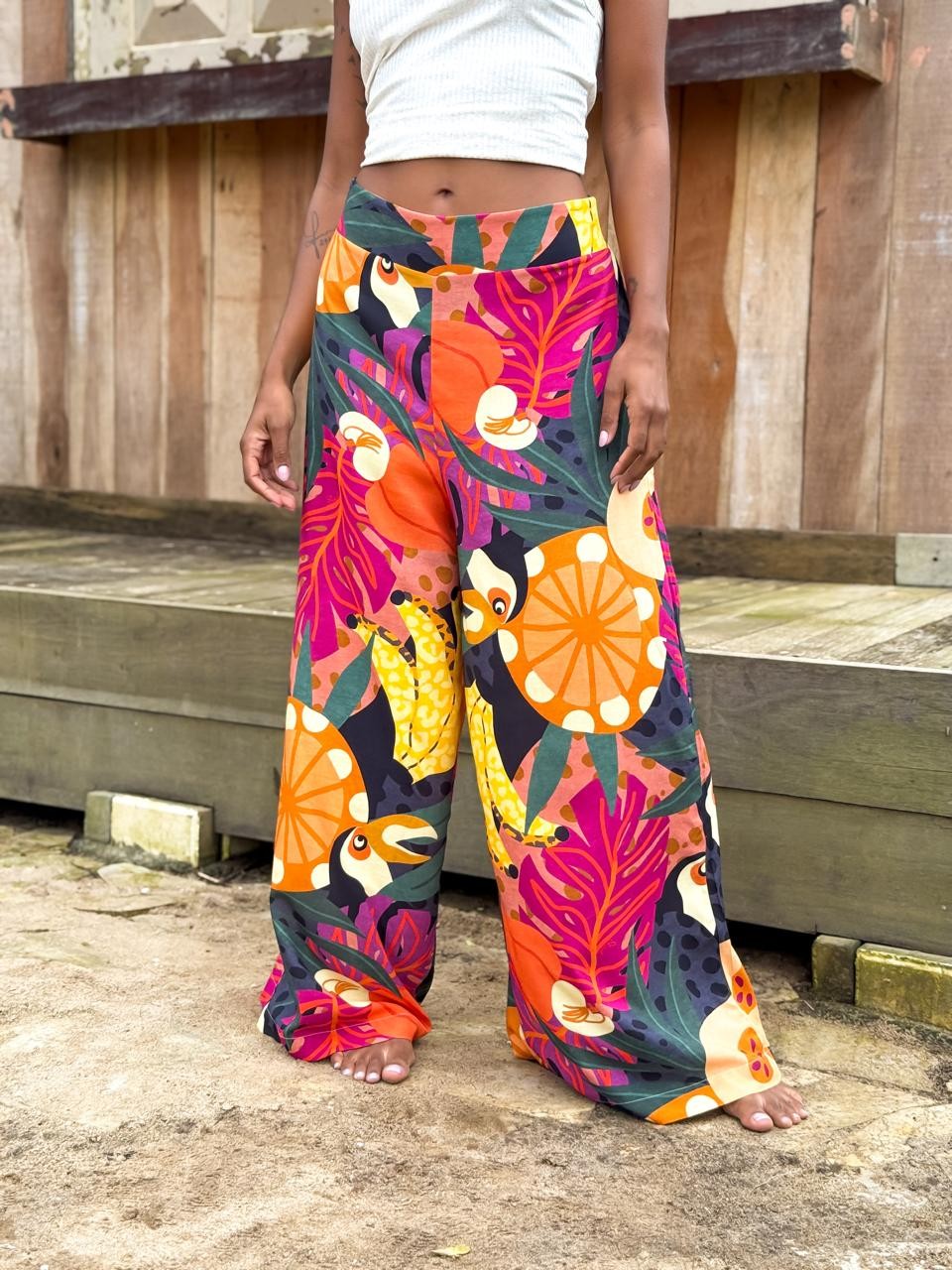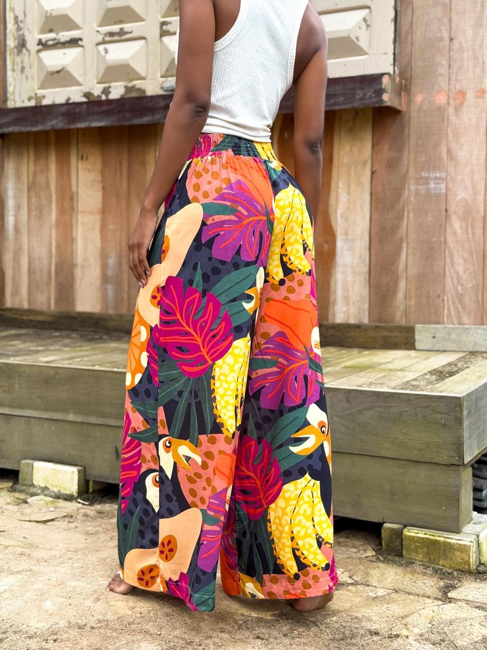 Calça ampla e fluida, confeccionada em tecido leve que garante conforto e liberdade de movimento. O modelo pantalona traz modernidade e elegância ao look, enquanto a estampa tropical vibrante, com folhagens, frutas e tucanos, adiciona alegria e personalidade à peça. Possui cós alto que valoriza a silhueta e permite combinações descontraídas ou sofisticadas, perfeita para dias de verão e produções cheias de estilo.