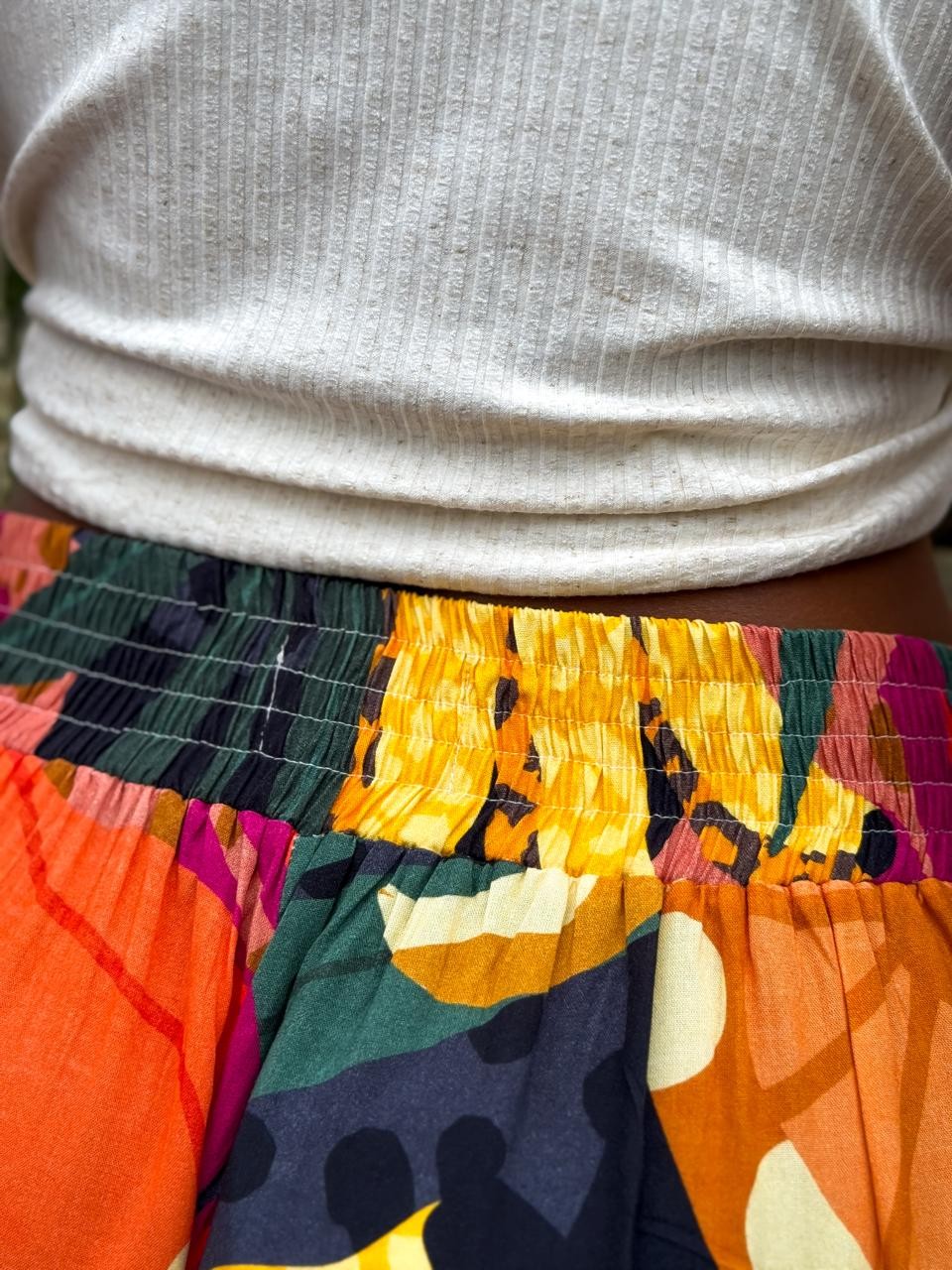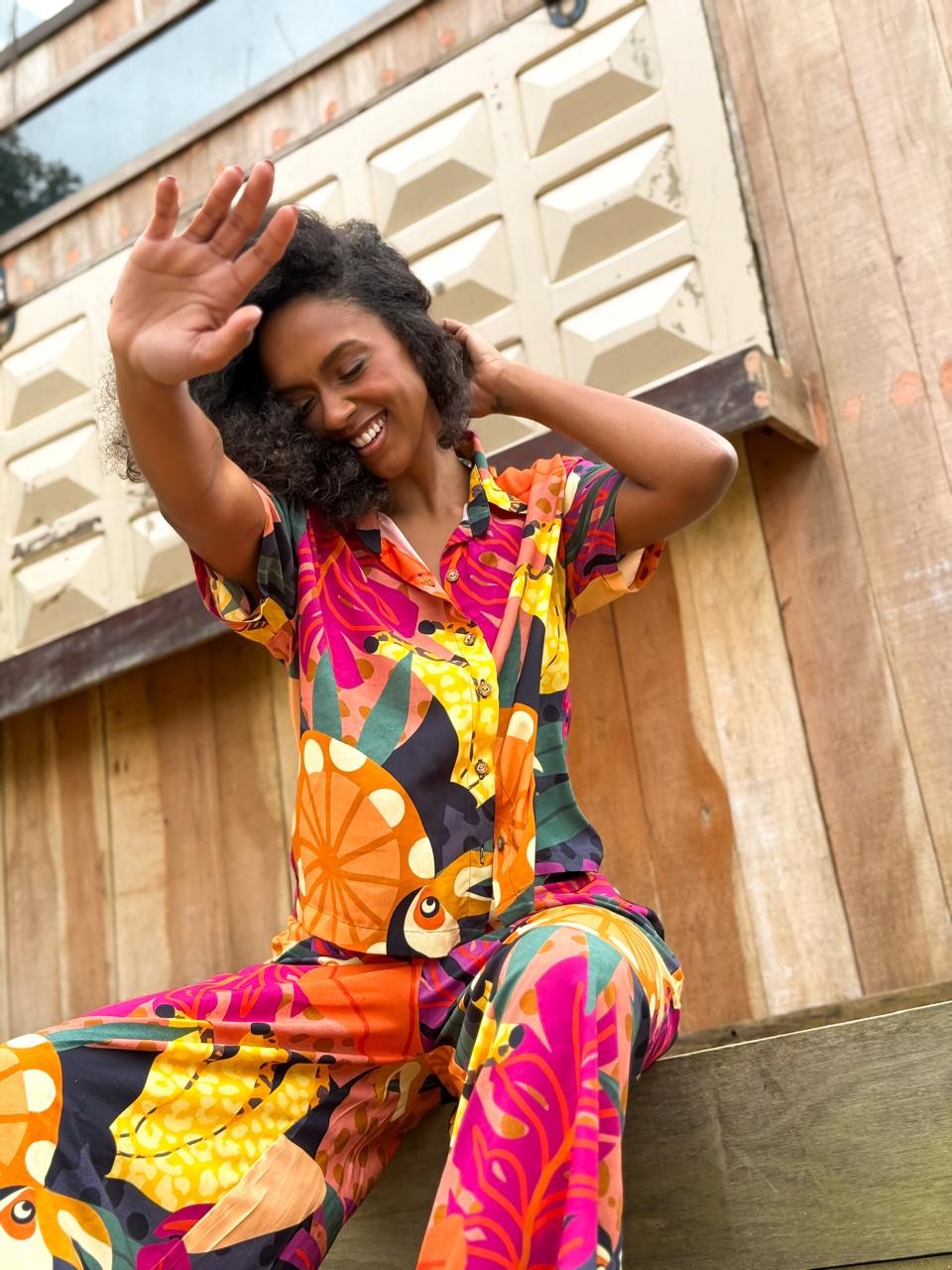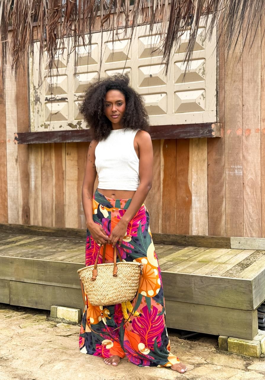 Calça ampla e fluida, confeccionada em tecido leve que garante conforto e liberdade de movimento. O modelo pantalona traz modernidade e elegância ao look, enquanto a estampa tropical vibrante, com folhagens, frutas e tucanos, adiciona alegria e personalidade à peça. Possui cós alto que valoriza a silhueta e permite combinações descontraídas ou sofisticadas, perfeita para dias de verão e produções cheias de estilo.