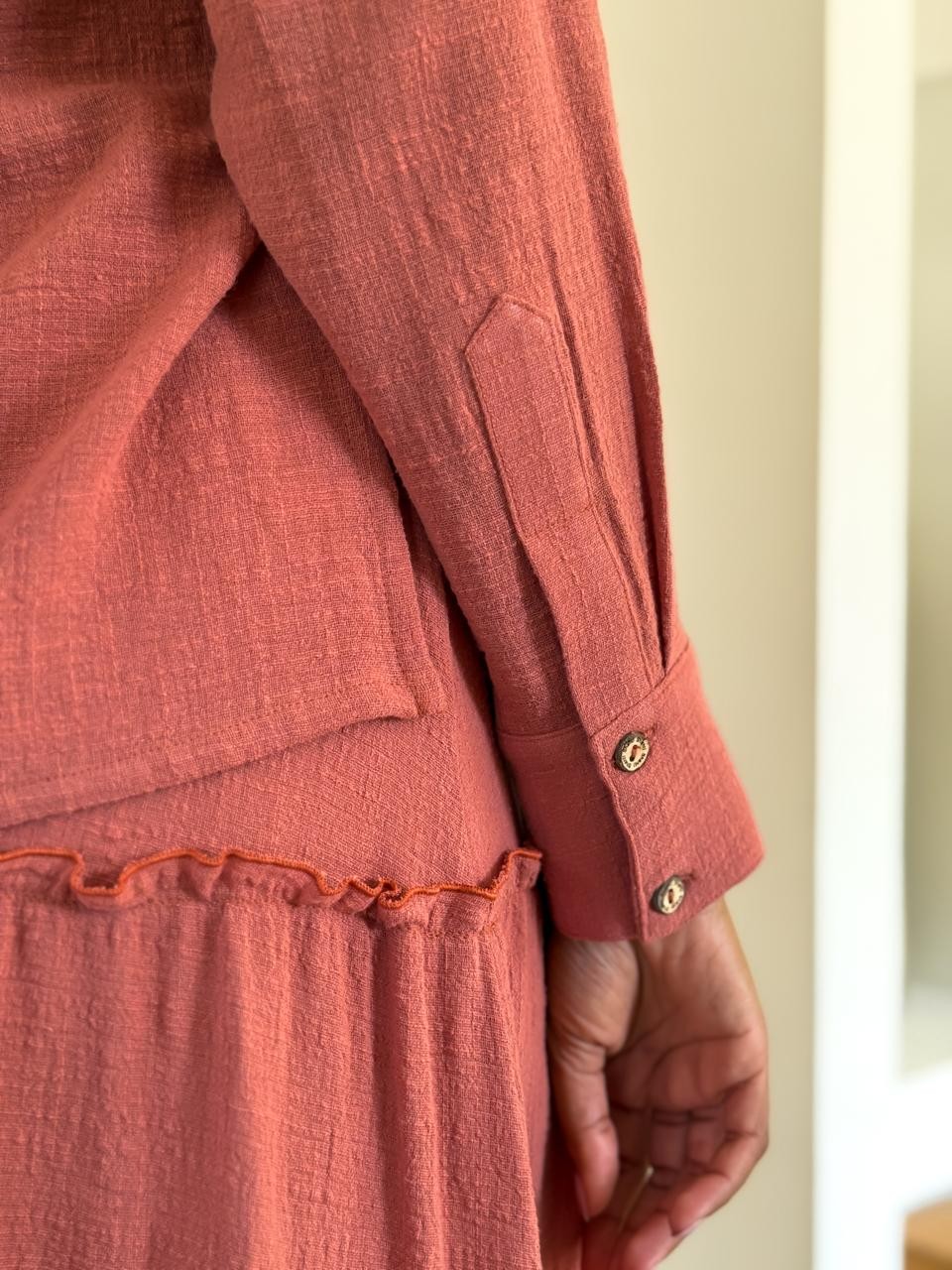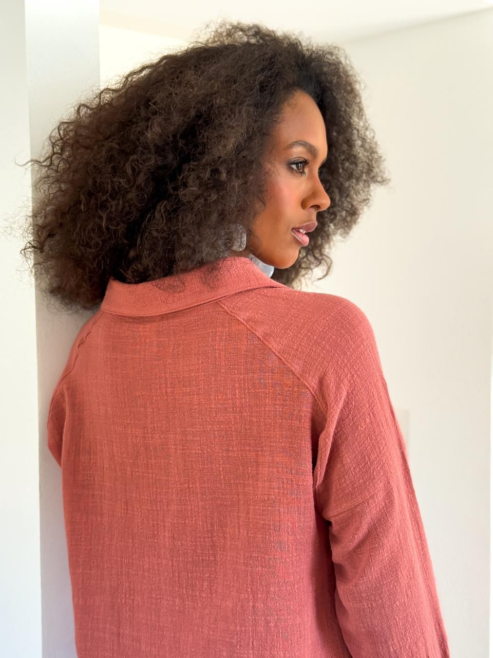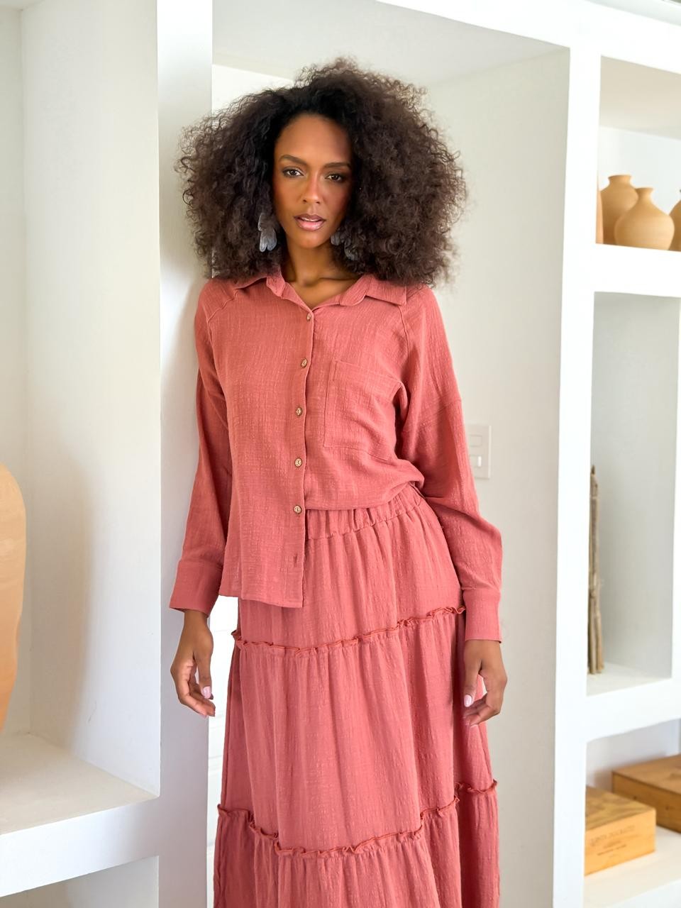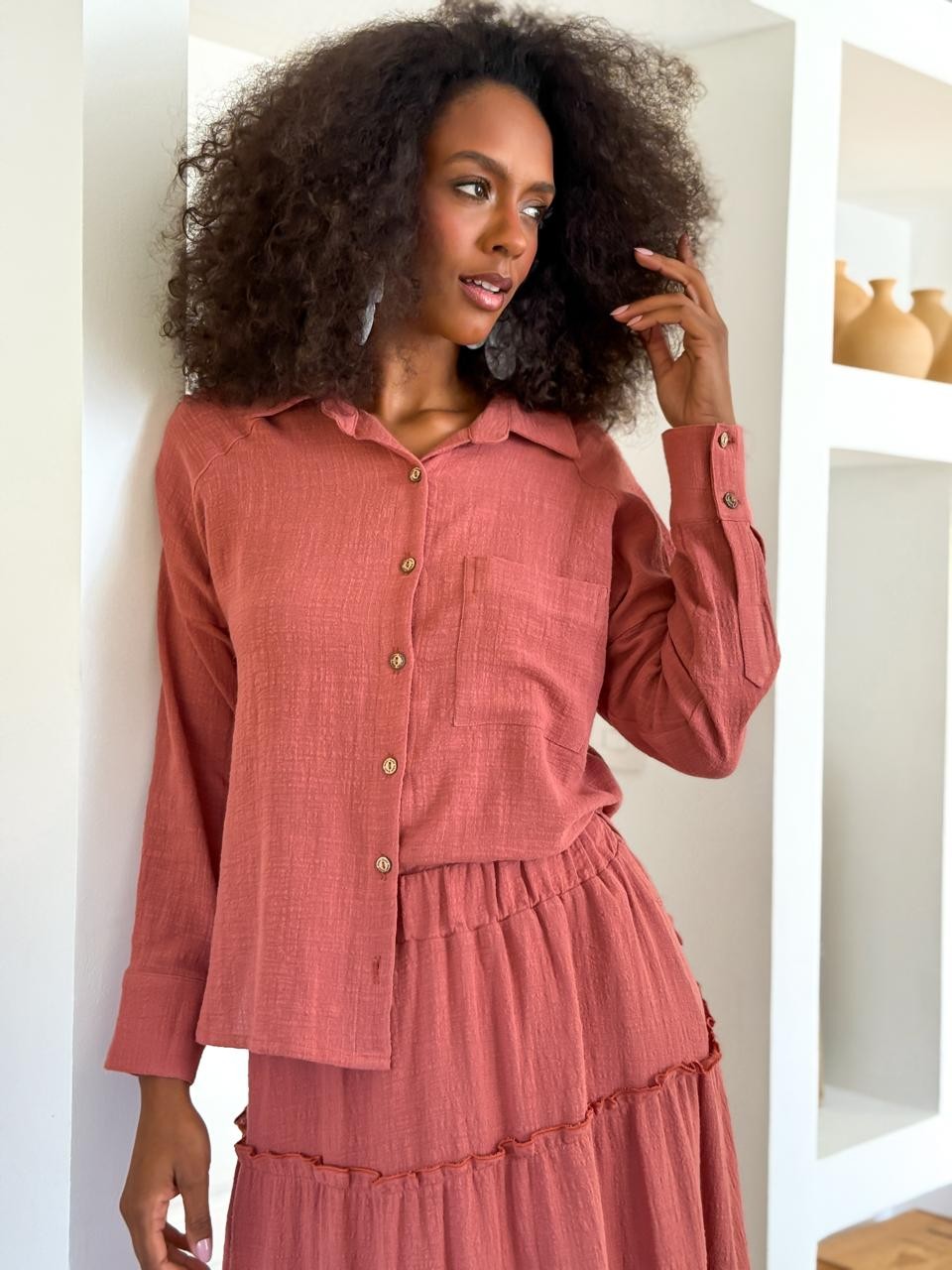 Camisa leve e confortável, confeccionada em tecido de algodão texturizado que traz um toque natural e sofisticado. Possui gola tradicional, fechamento frontal por botões e mangas longas, perfeita para compor looks casuais ou elegantes. O caimento solto garante movimento e frescor, ideal para os dias mais quentes.Camisa em algodão texturizada.