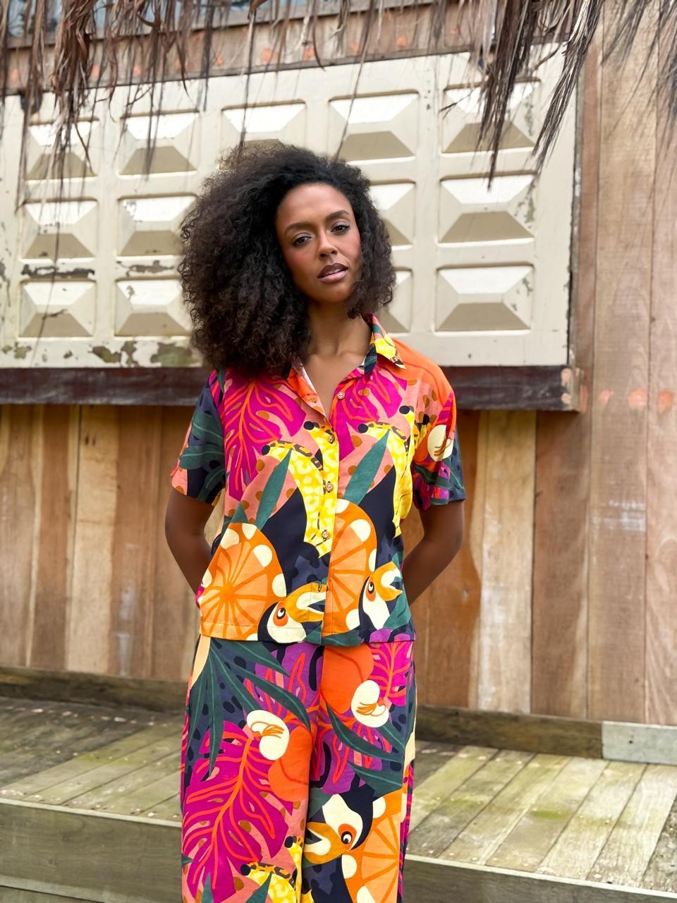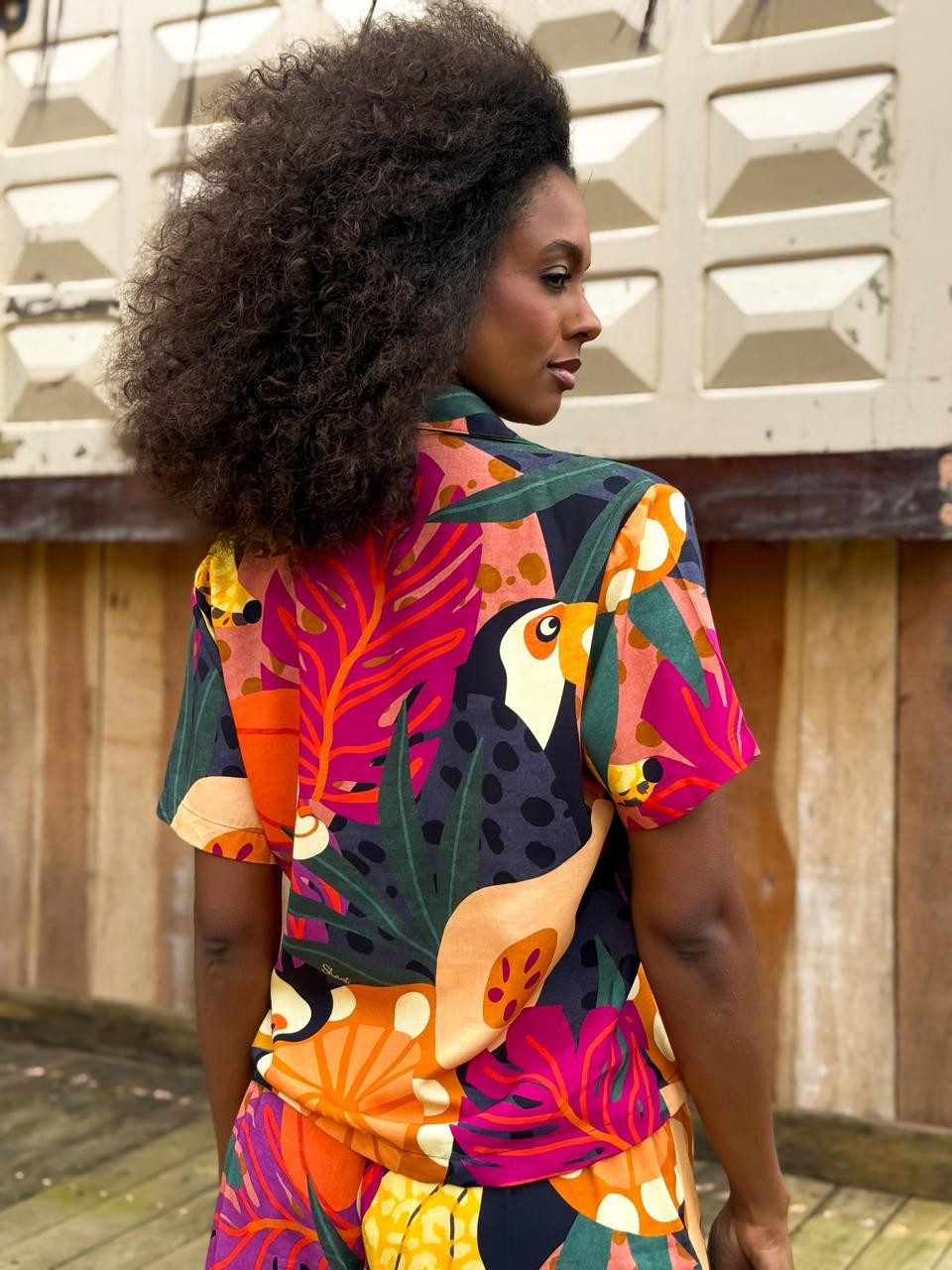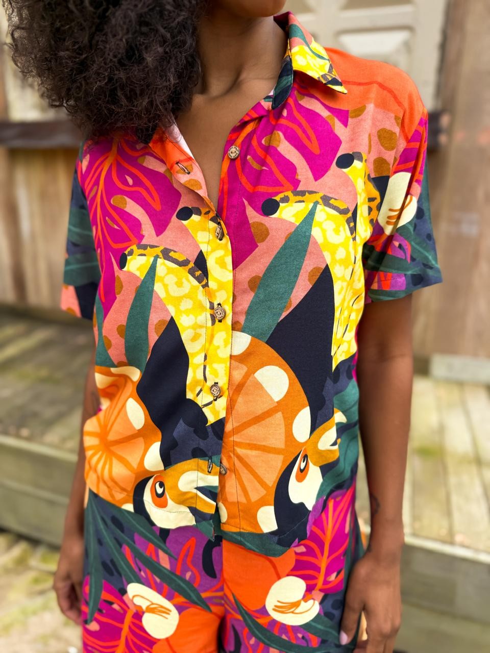 Camisa de manga curta confeccionada em tecido leve e confortável. Possui modelagem soltinha, fechamento frontal por botões e estampa tropical exclusiva, com tucanos, frutas e folhagens em cores vibrantes que trazem frescor e autenticidade ao look. Perfeita para composições despojadas e cheias de estilo.