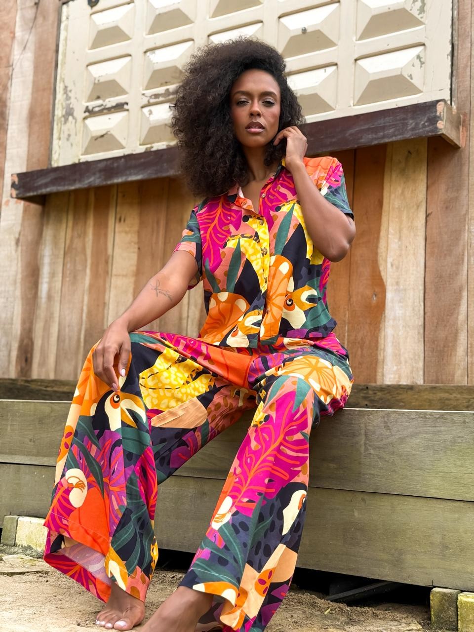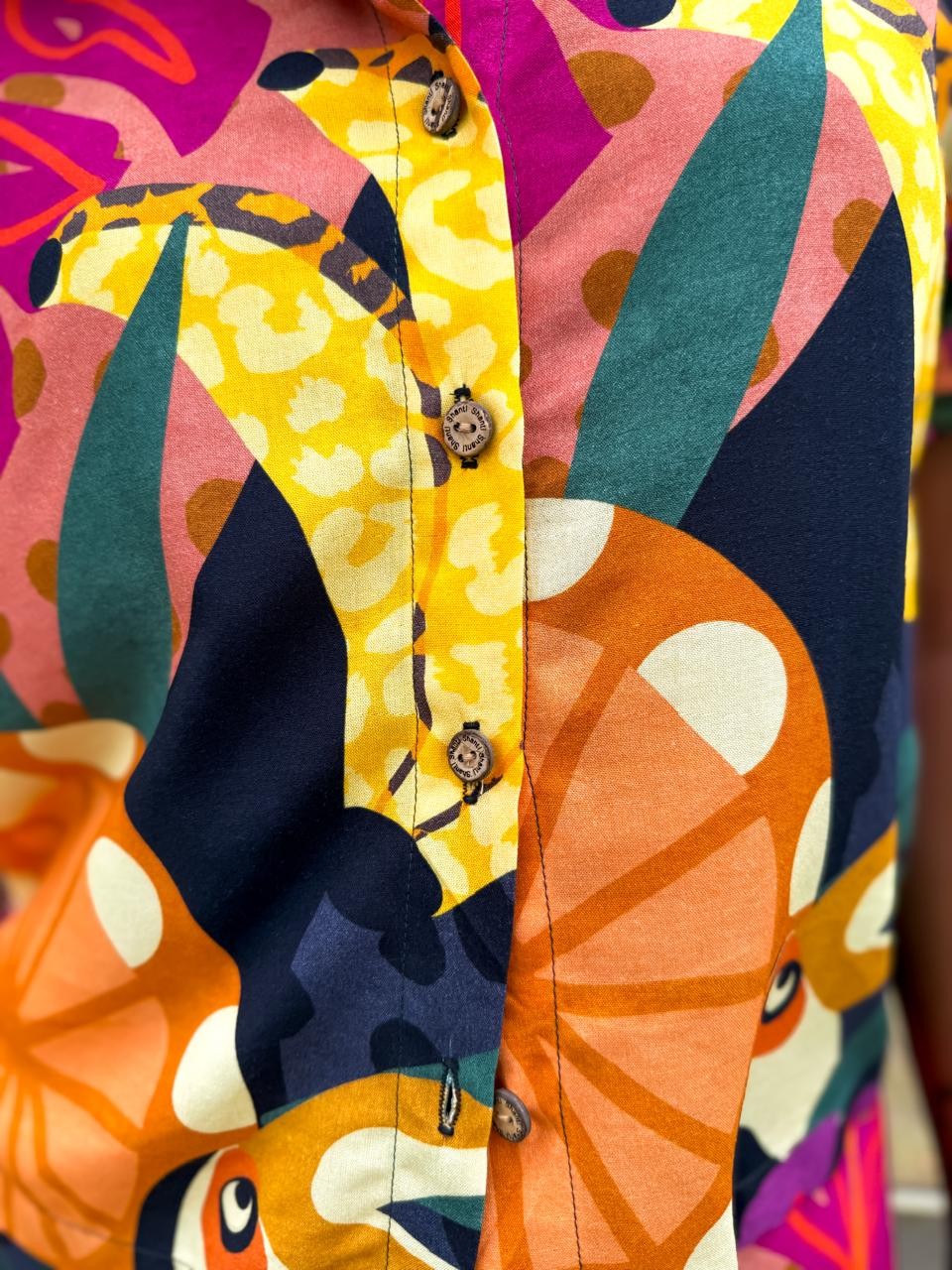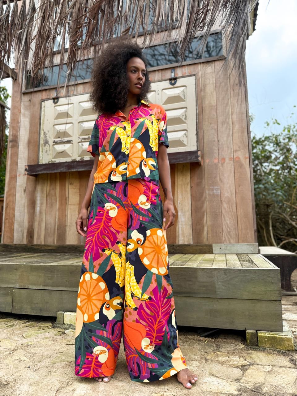 Camisa de manga curta confeccionada em tecido leve e confortável. Possui modelagem soltinha, fechamento frontal por botões e estampa tropical exclusiva, com tucanos, frutas e folhagens em cores vibrantes que trazem frescor e autenticidade ao look. Perfeita para composições despojadas e cheias de estilo.