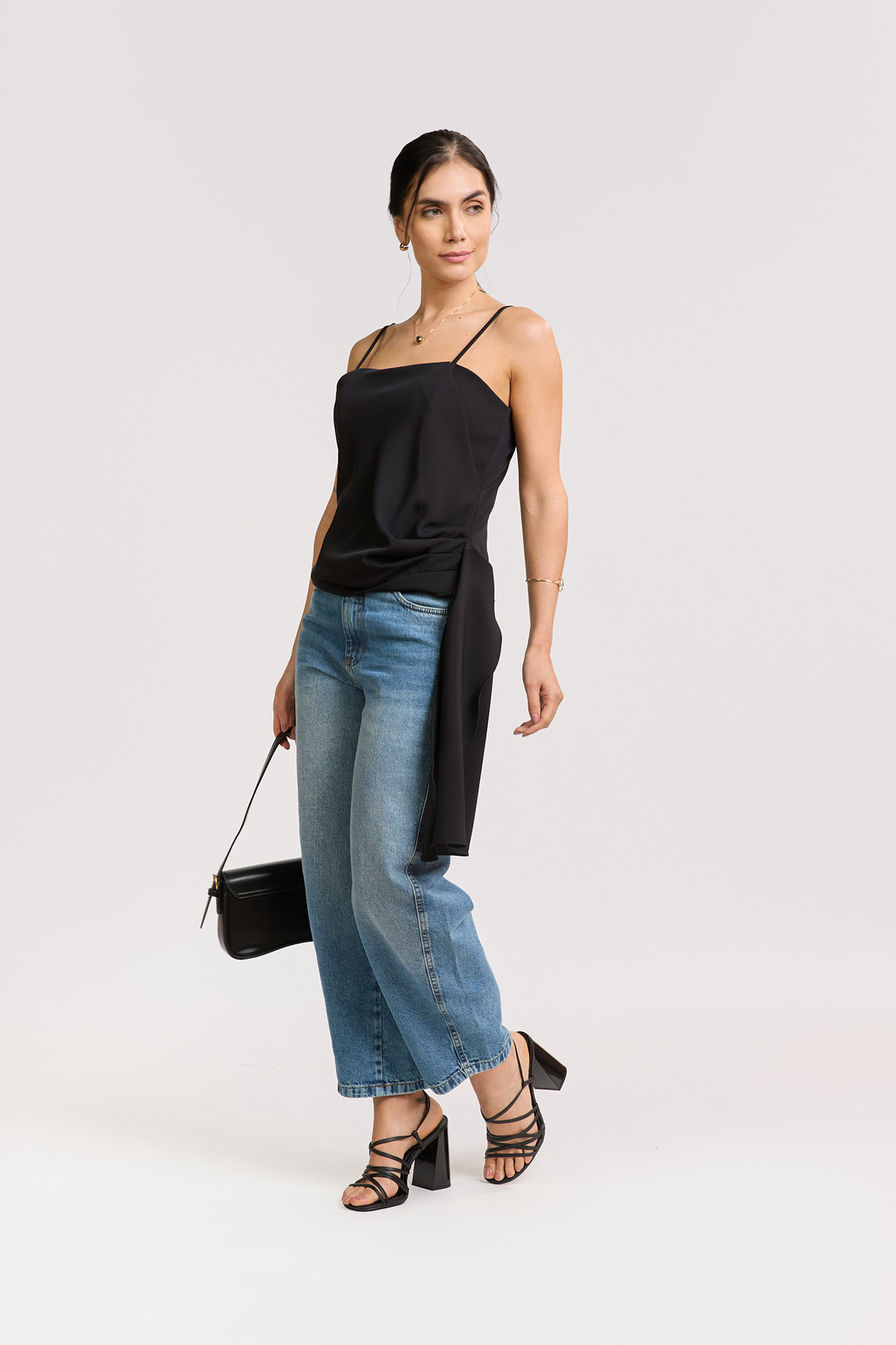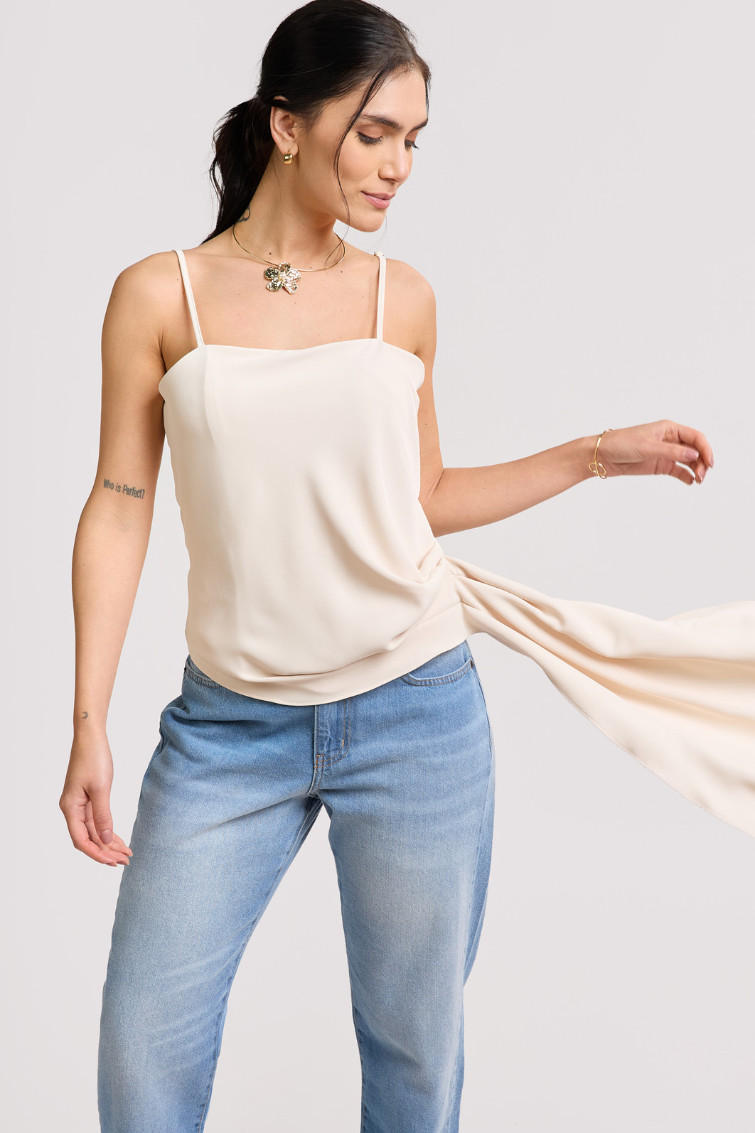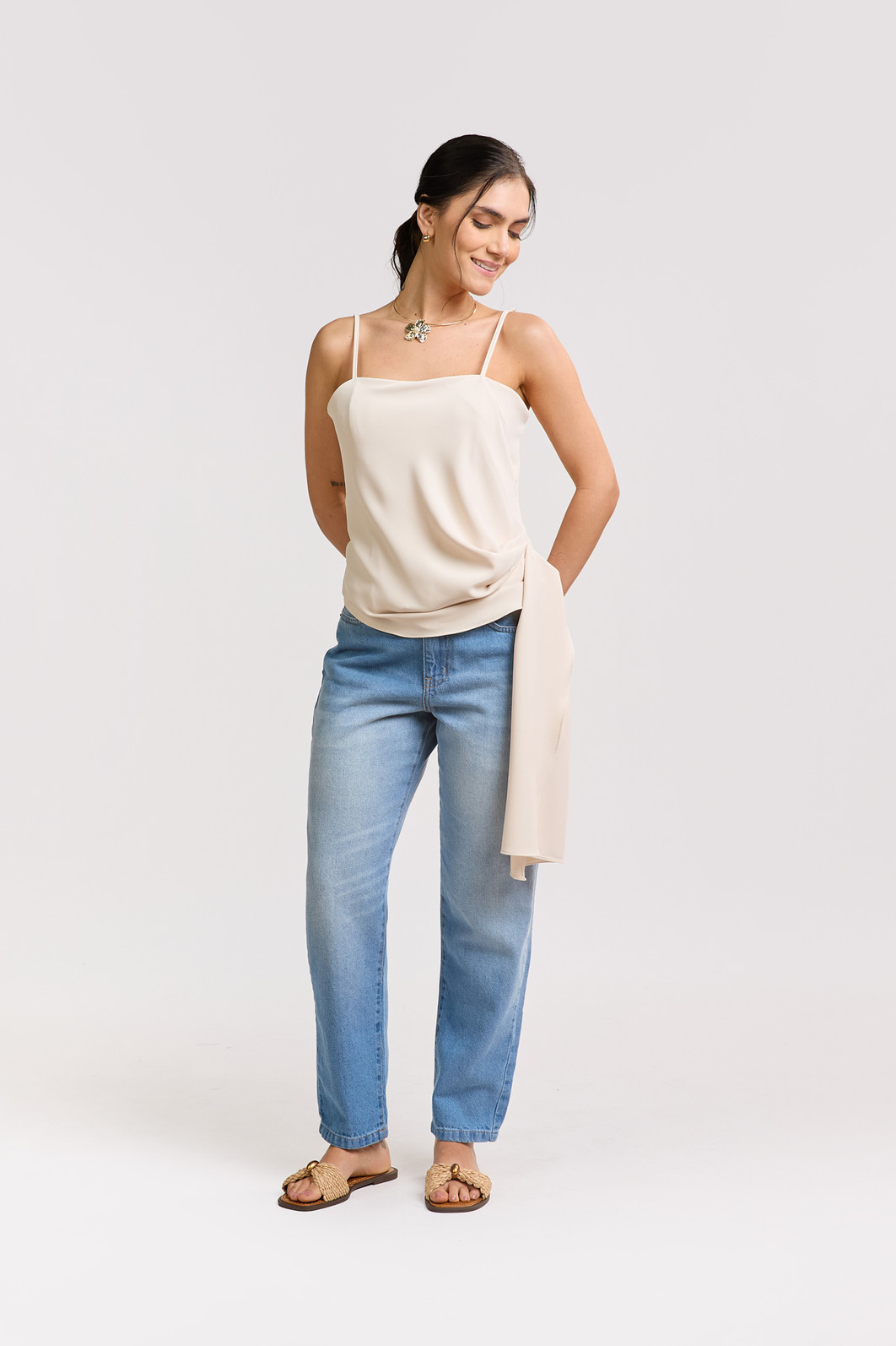 Blusa reta e minimalista, que valoriza a delicadeza e a sofisticação da peça. O grande destaque está no detalhe lateral com faixa fluida, que traz movimento e um toque de modernidade ao look.