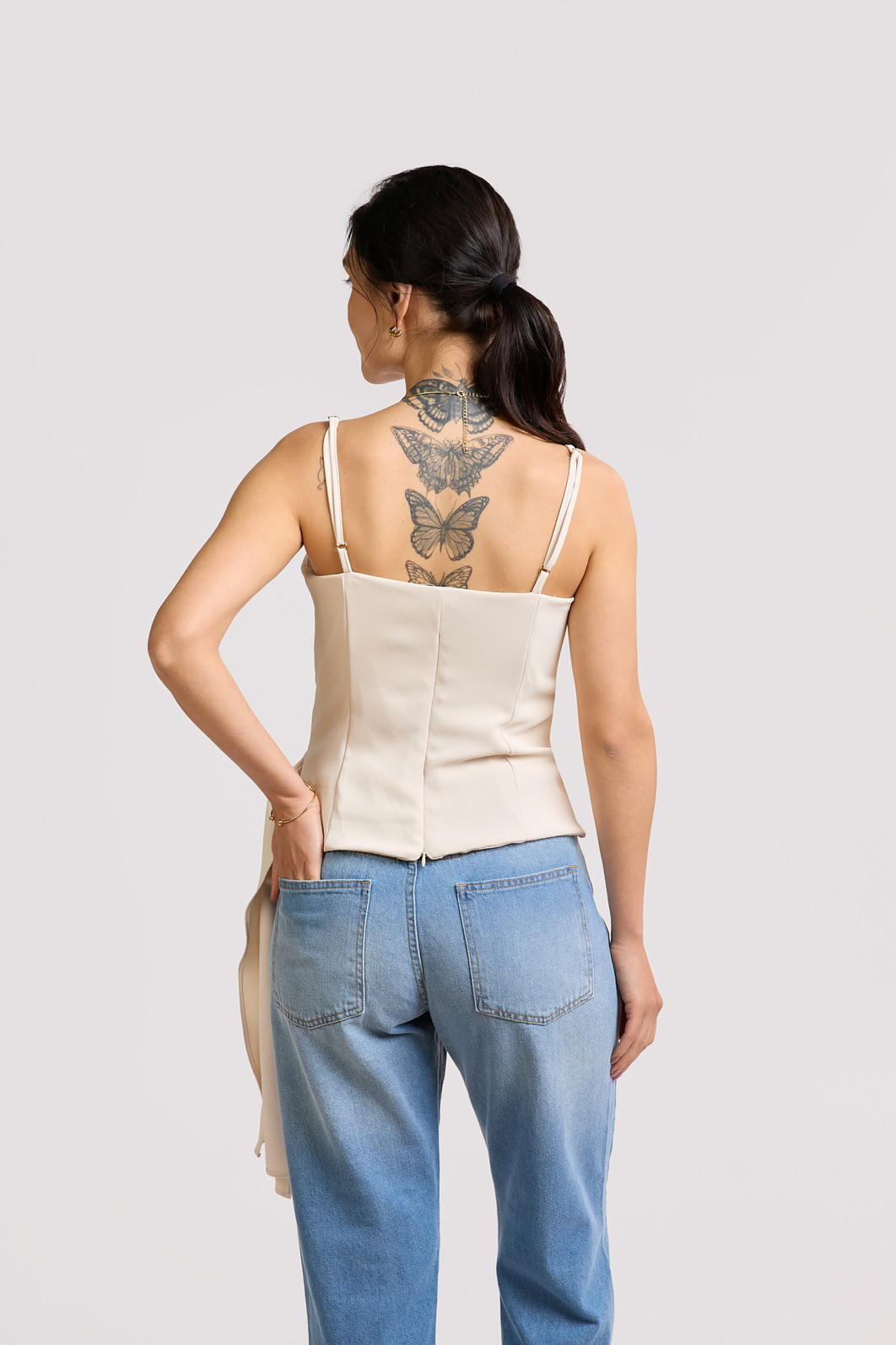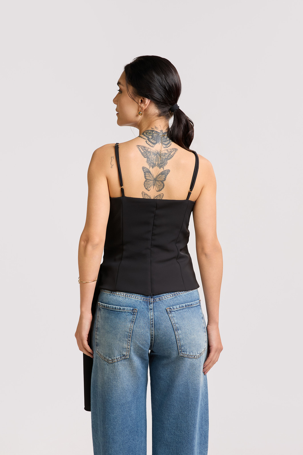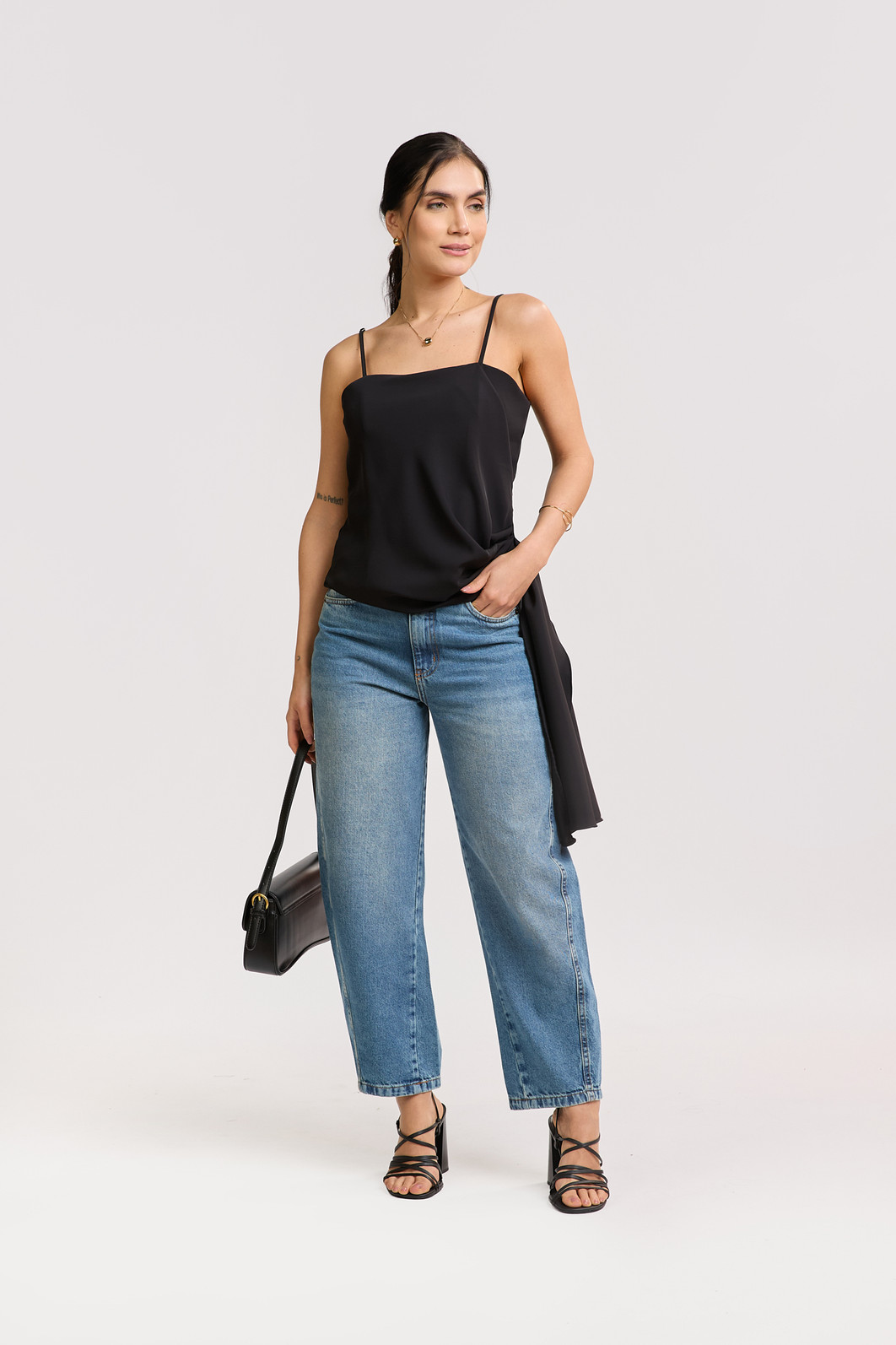 Blusa reta e minimalista, que valoriza a delicadeza e a sofisticação da peça. O grande destaque está no detalhe lateral com faixa fluida, que traz movimento e um toque de modernidade ao look.