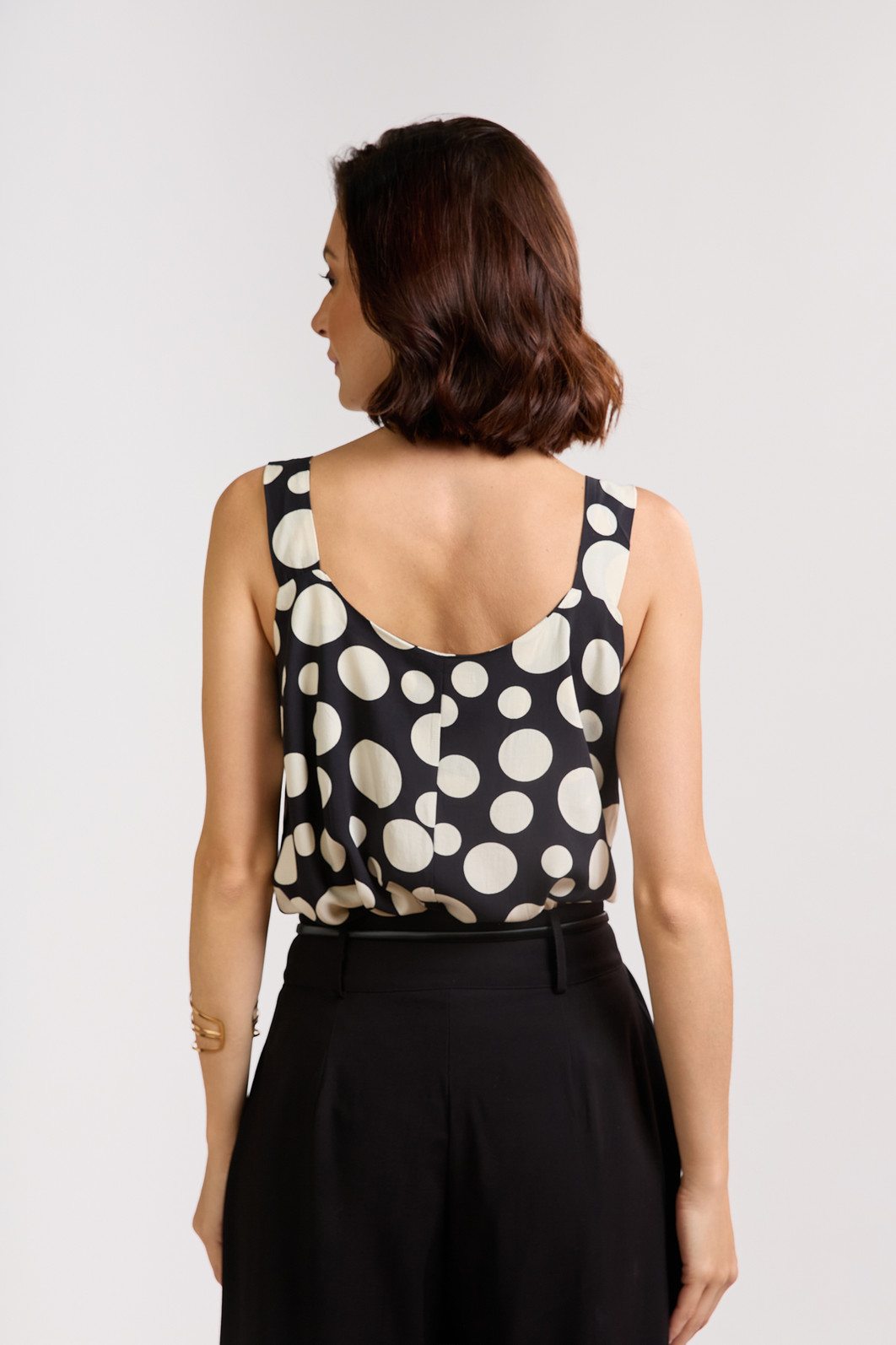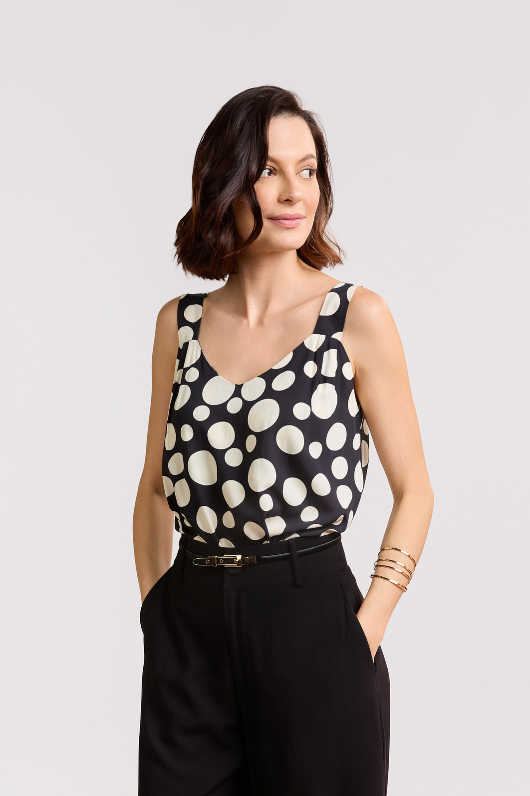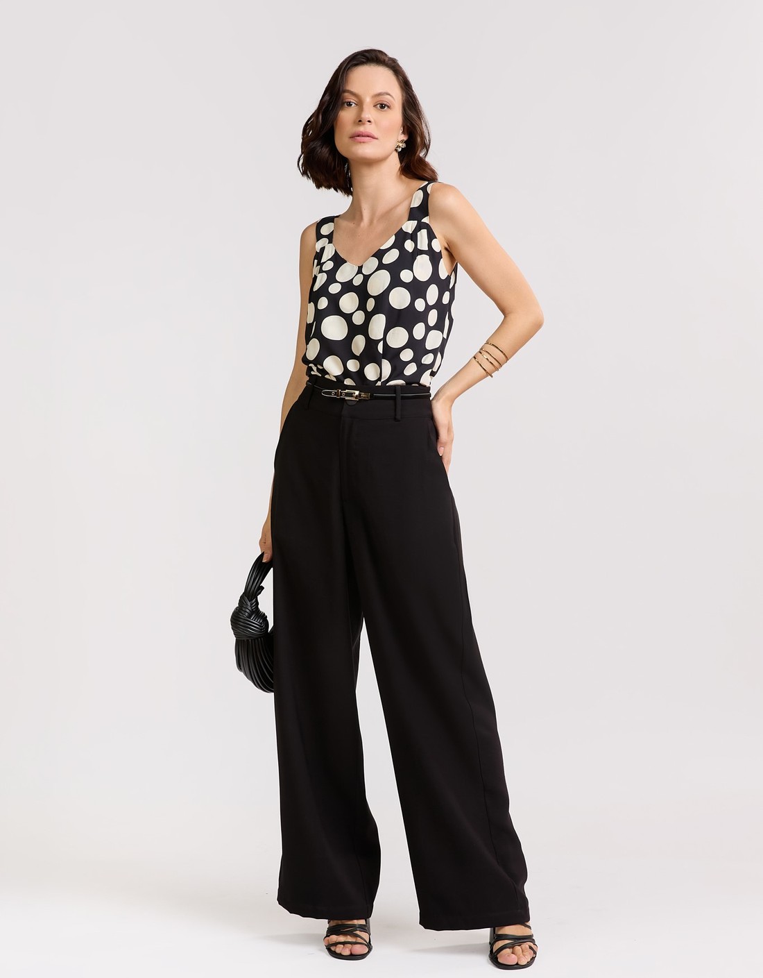 O charme da peça está na estampa de maxi poás, que traz um toque clássico e atemporal, além de ser fácil de combinar tanto com peças de alfaiataria quanto com jeans, criando desde looks casuais até produções mais refinadas.