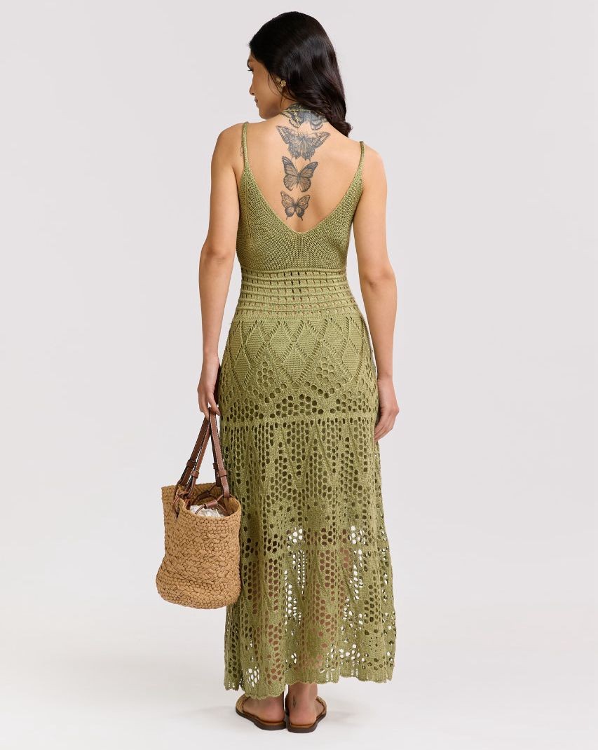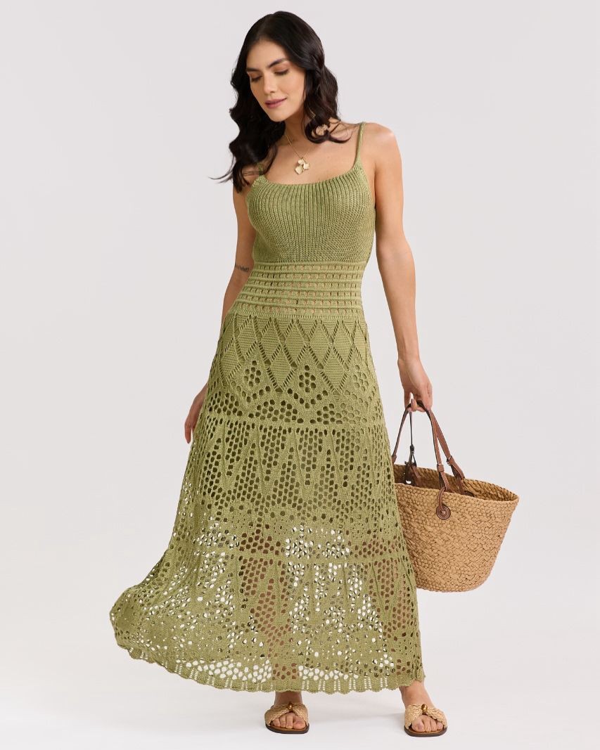 Vestido midi em crochê, desenvolvido em ponto trabalhado com riqueza de detalhes e sofisticação. A peça possui alças finas, decote arredondado ou V e caimento fluido, que valoriza a silhueta com leveza e movimento. O corpo é ajustado de forma delicada, enquanto a saia se abre em desenhos geométricos e rendados, criando transparências estratégicas que trazem frescor e elegância ao visual.